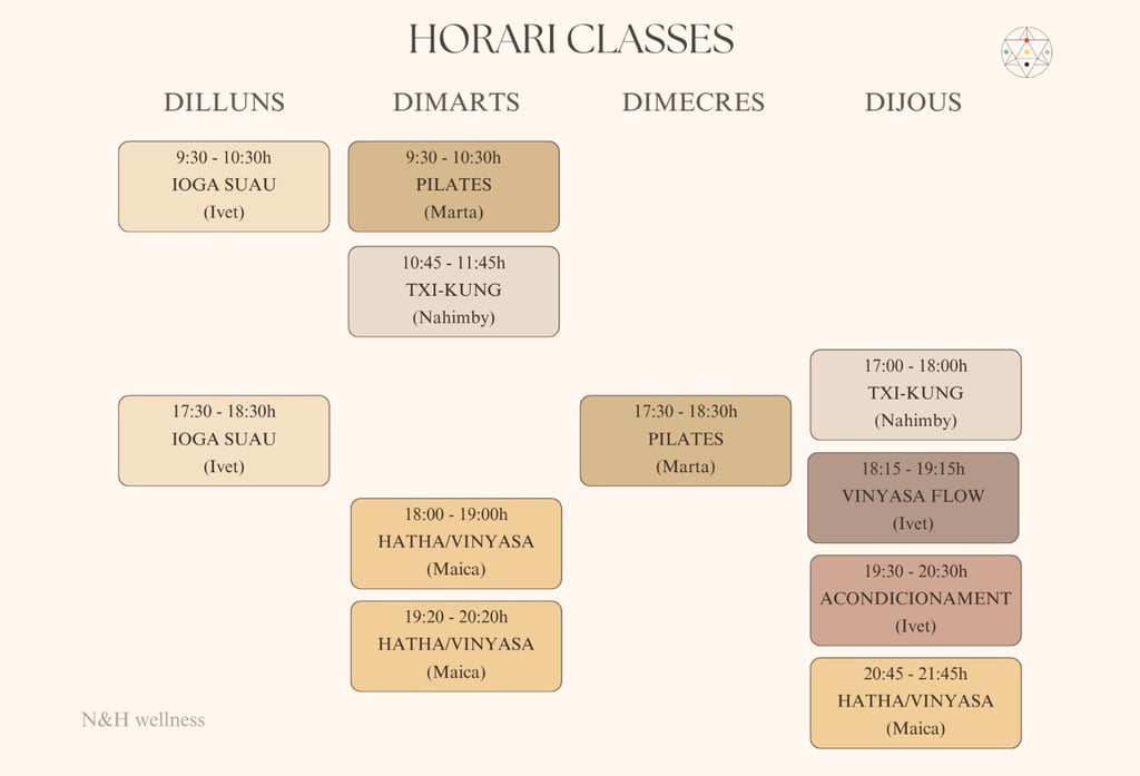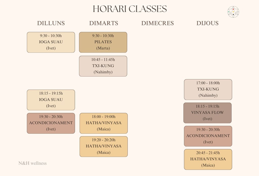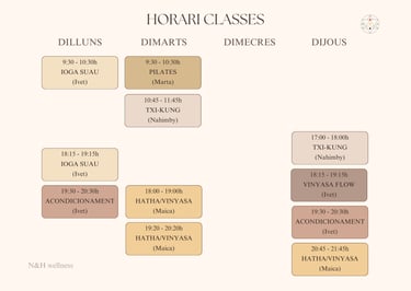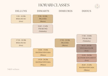 Pot haver-hi riscos associats amb la participació en les activitats i entrenaments del centre N&H Wellness, mencionats al lloc web i a les xarxes socials. Tot i que es donen instruccions per a la pràctica de les disciplines que oferim, cal tenir en compte que poden implicar un risc de lesió. Si decideixes participar-hi, ho fas lliurement, conscientment i sota la teva pròpia responsabilitat, assumint tots els riscos associats a aquests exercicis, pràctiques i activitats. Aquests riscos també poden existir per a persones que actualment es troben en bon estat de salut. El centre N&H Wellness no és responsable de cap lesió ni problema de salut que puguis experimentar com a resultat de l’ús de qualsevol producte o servei de N&H Wellness.